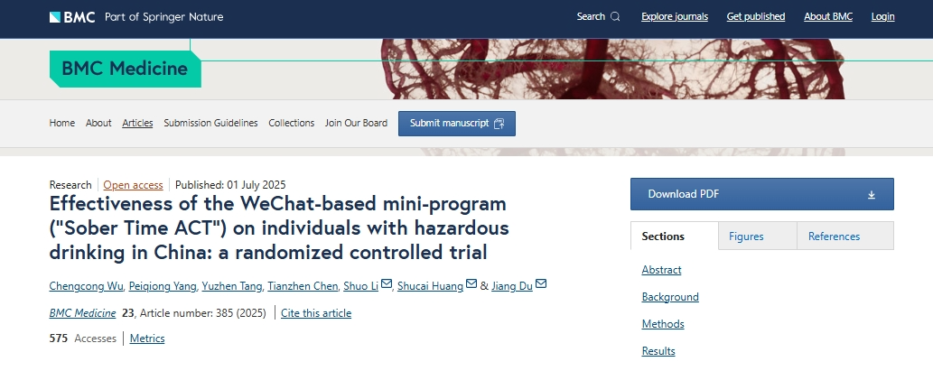 由曼朗医疗(Mindfront)与上海交通大学医学院附属上海精神卫生中心成瘾医学科联合开发的"Sobertime ACT"微信小程序(中文:清醒时光),其临床研究成果近日在国际顶级医学期刊《BMC Medicine》(影响因子8.3)正式发表。